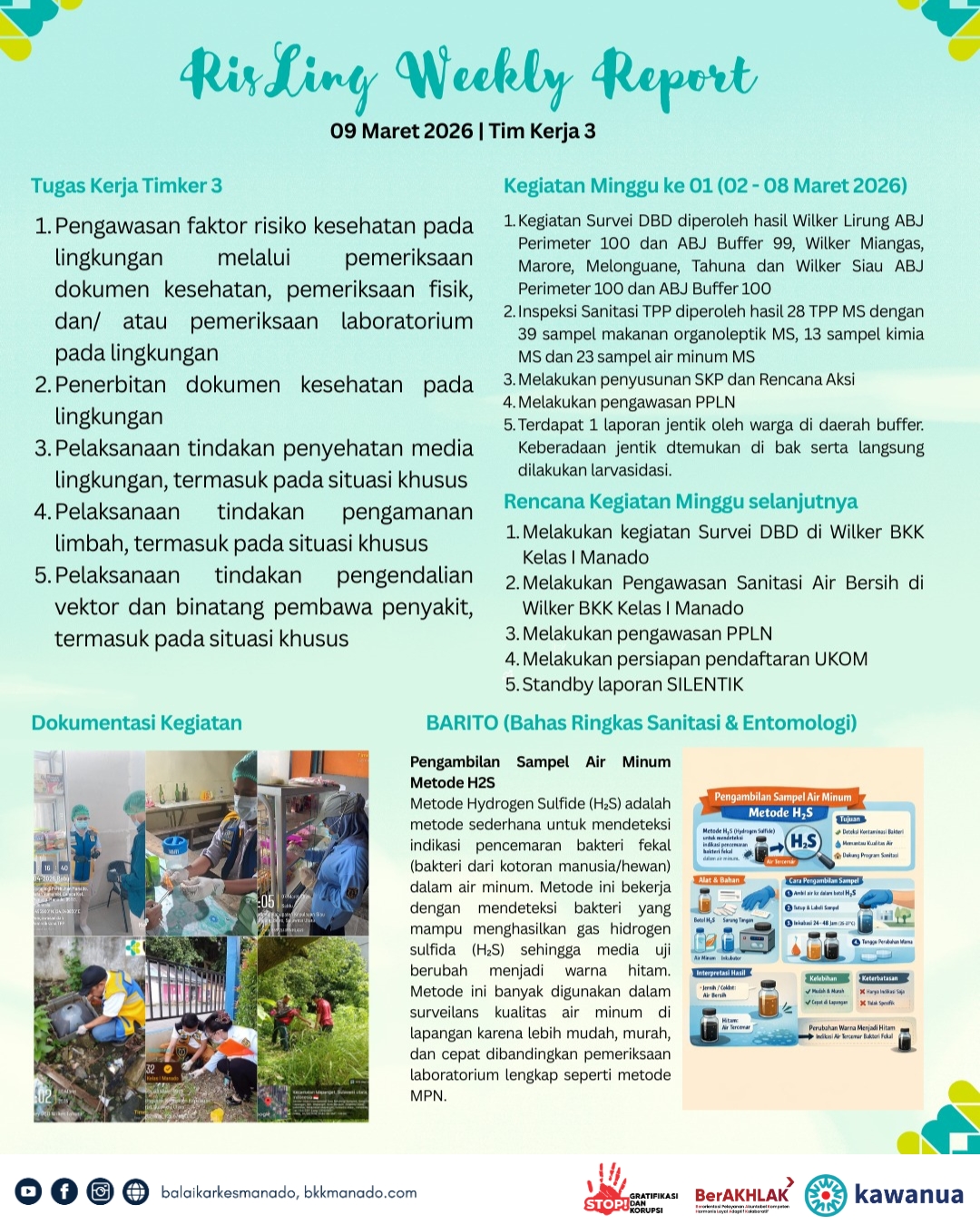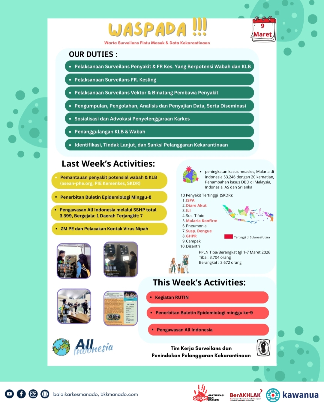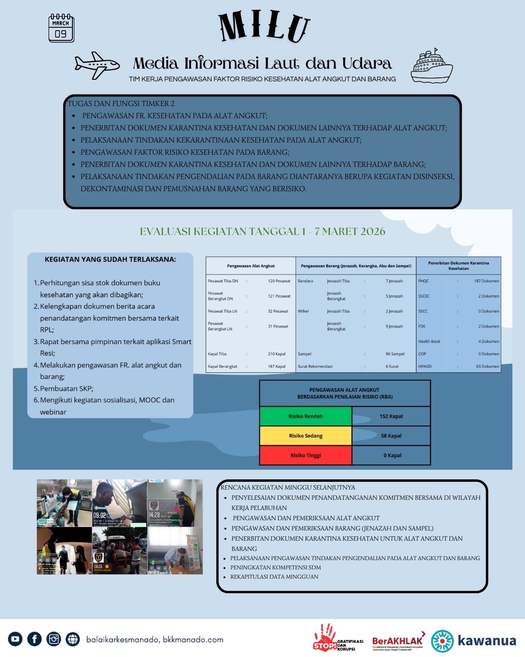 Kegiatan ini dipimpin langsung oleh Kepala Balai drg. Resi Arisandi, MM, MH, SH untuk mempresentasikan evaluasi kegiatan masing-masing tim kerja di minggu sebelumnya, dan kegiatan yang direncanakan sepanjang minggu berjalan.#balaikarkesmanado #karantinakesehatan #kawanua