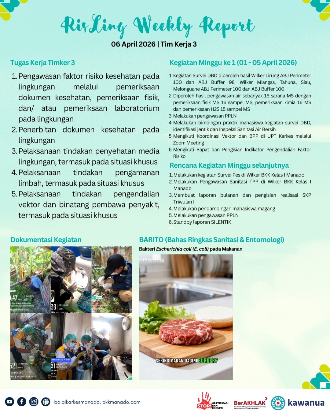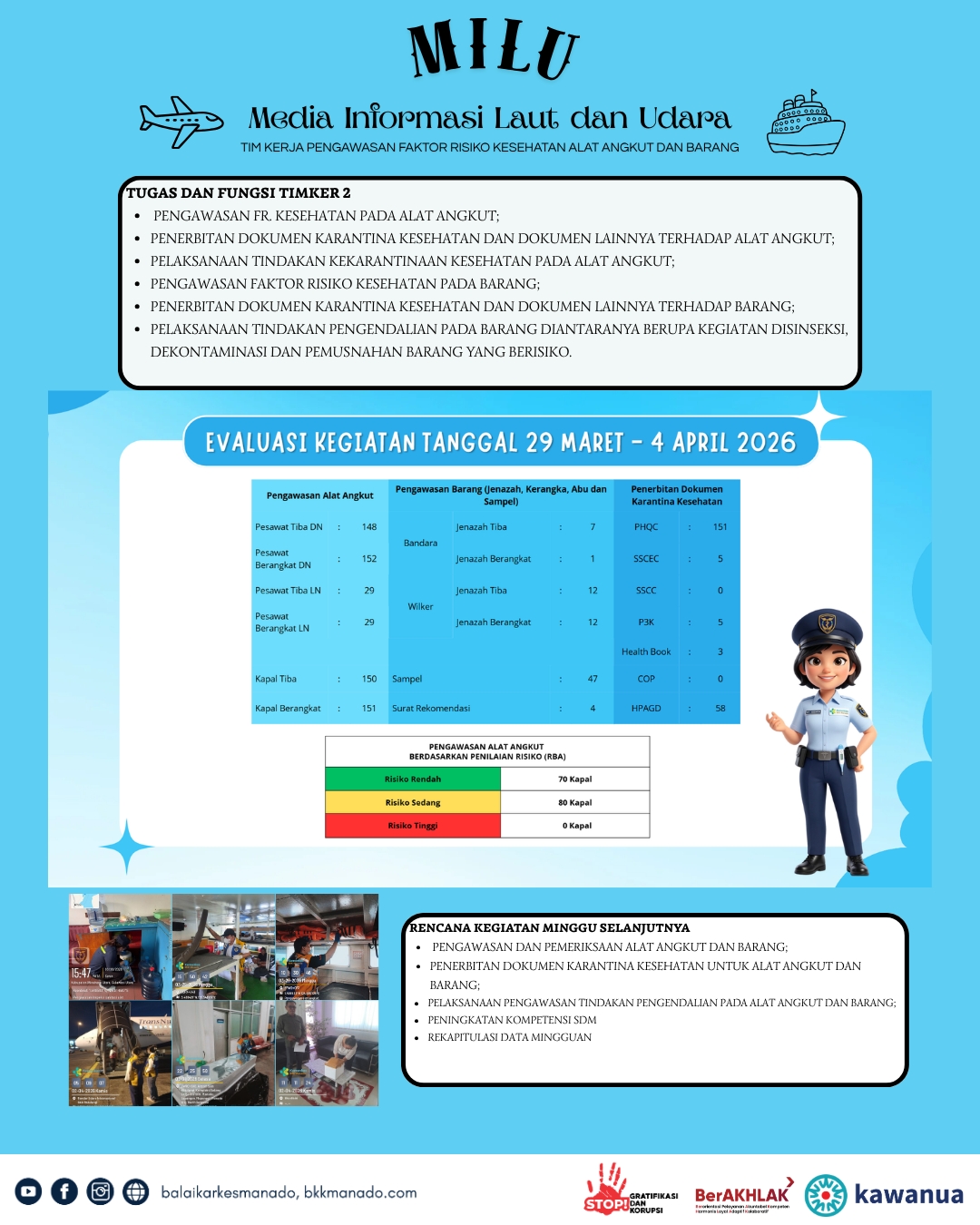 Balai Kekarantinaan Kesehatan Kelas I Manado kembali melaksanakan Monday Morning Briefing (MMB) yang diikuti oleh seluruh pegawai, baik di Kantor Induk maupun Wilayah Kerja (secara daring melalui Zoom) Kegiatan ini dipimpin langsung oleh Kepala Balai drg. Resi Arisandi, MM, MH, SH untuk mempresentasikan evaluasi kegiatan masing-masing tim kerja di minggu sebelumnya, dan kegiatan yang direncanakan sepanjang minggu berjalan.